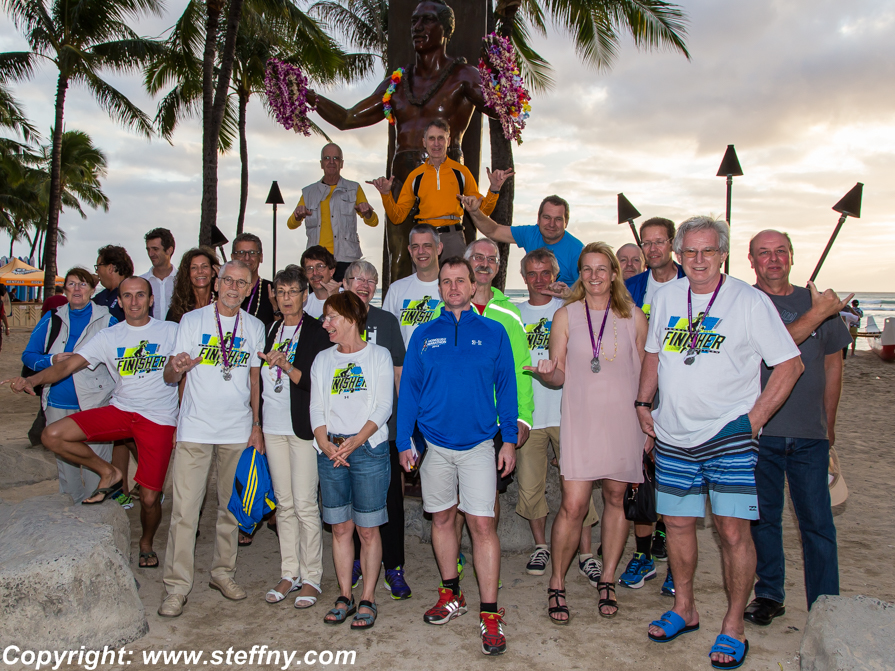 ![]() Unsere InterAir Reisegruppe gut gelaunt nach dem Rennen unter der Statue von Olympiasieger Duke Kahanamoku (Foto, Copyright: Herbert Steffny) |