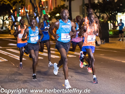 Anders der Auftritt des 29-jährigen Lawrence Cherono aus Eldoret, der bei seinem zweiten Start im 50. Bundesstaat der USA zum zweiten Mal einen Rekordlauf hinlegte, der ihm mit 25.000 Dollar plus weitere 25.000 Dollar Zeitbonus einbrachte. „Der Marathonlauf hat mein Leben komplett verändert“ sagte Cherono bereits im Vorjahr. Schon bei fünf Kilometern hatte er sich diesmal gut gefühlt. Bei Halbmarathon (65:32 Minuten) war noch ein Kenia-Quintett zusammen. Zunächst griff Wilson Chebet nach 30 Kilometern an, doch Cherono konterte in der Nobelwohngegend Kahala und hatte bei 36 Kilometern vor dem zweiten Anstieg um den Diamond Head Krater bereits 150 Meter Vorsprung. Hinter Cherono, der mit 2:08:27 Stunden seine eigen Marke vom Vorjahr deutlich verbesserte, beendete Wilson Chebet in 2:09:55 Stunden zum dritten Mal in Folge das Rennen auf dem zweiten Platz. Vincent Yator komplettierte das Podium im wunderschönen Kapiolani Park in ebenfalls noch erstklassigen 2:10:37 Stunden.