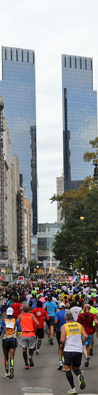 ![]() Central Park South, nur noch einen Kilometer müssen die Teilnehmer bis zum Ziel bewältigen. (Foto, Copyright: www.steffny.com) | Safety first - die Sicherheit gewinnt den NYC Marathon Die großen US-amerikanischen Marathons wurden in den letzten zwei Jahren schwer vom Schicksal geprüft. Im Frühjahr starben wegen eines Bombenattentats am Zieleinlauf des Boston Marathons drei Menschen, 260 wurden verletzt und im letzten Jahr fiel der New York City Marathon als politisches Bauernopfer wegen der Verwüstungen des Sturmes Sandy aus. Man ist bei der Einreise in die USA bereits einiges gewohnt, was einem an Sicherheitsauflagen und erkennungsdienstlichen Behandlungen zugemutet wird. Wegen der terroristischen Bedrohung, die in den USA als nationales Trauma nun leider auch Marathonveranstaltungen betrifft, wurden die Sicherheitsmaßnahmen auf einen neuen Level angehoben. Eine Million Dollar investierte der ausrichtende New York Roadrunners Club in Sicherheitsmaßnahmen. Neben offensichtlicher erhöhter Polizeipräsenz checkten Hunderte von Zivilbeamten und 43 Bomben-Schnüffelhunde verdächtige Taschen und Personen entlang der vermehrt abgesperrten Strecke. Die Läufer durften keine (Trink-)Rucksäcke, größere Gürteltaschen oder Wasserflaschen, Verkleidungen und Gesichtsmasken tragen. Laufkinderwagen wurden verboten. Weniger