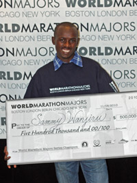 Weltrekord gelaufen! Zweimal Gewinner des 500.000 Dollar Jackpots Wanjiru galt natürlich jetzt als erster Anwärter, den Äthiopiern den Marathon Weltrekord wieder zu entreissen. Paul Tergat hatte die Marke vorübergehend 2003 mit 2:04:55 Stunden nach Kenia geholt, bis Haile Gebrselassie den Rekord zweimal in Berlin, zuletzt 2008 auf 2:03:59 Stunden verbesserte. Wanjiru siegte 2009 jeweils wieder in Streckenrekord zunächst in London mit 2:05:10 Stunden und beim renommierten Chicago Marathon in 2:05:41 Stunden. 2010 wiederholter er seinen Sieg in Chicago in 2:06:24 Stunden. Wanjiru war auf seinem sportlichen Zenith und kassierte für afrikanische Verhältnisse Unsummen. Zweimal gewann er den mit 500.000 Dollar dotierten Jackpot der World Marathon Majors Serie. Allein sein Antrittsgeld für einen Marathon dürfte 250.000 Dollar gewesen sein. Man schätzt sein Einkommen zwischen 2007 und 2010 auf mindestens sechs Million Dollar. Das entspricht in Kenia einem Gegenwert an Kaufkraft in Höhe von rund 150 Million Euro!